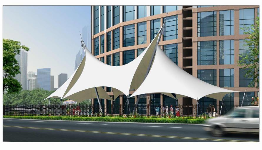 張拉結構單元通常為平行排列。當單元的張拉方向與空間的軸線方向產生旋轉時,單 元的跨度得以延長,膜布的曲線增加,同時避免了端部視角所形成的單元間彼此的遮擋,使膜結構的造型特點充分展示出來。