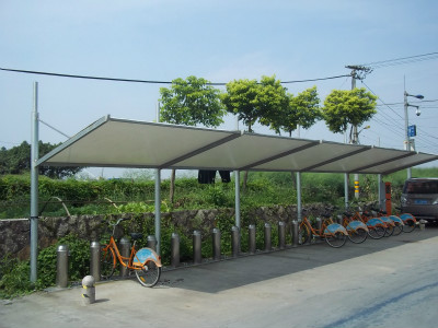 據(jù)了解,現(xiàn)已建成的公共自行車(chē)棚有的采用鐵皮材料,有的采用防銹鋼材,各有各優(yōu)劣點(diǎn),由于自行車(chē)棚相對(duì)于汽車(chē)棚來(lái)說(shuō)屬于窄長(zhǎng)形的,所以款式要求簡(jiǎn)潔明快,另外有不少站點(diǎn)都設(shè)置在商家前面的人行道上,搭建車(chē)棚時(shí)須注意視野的開(kāi)闊性。今天小編介紹一下以張拉膜為建造形式的膜結(jié)構(gòu)自行車(chē)棚,如下圖: