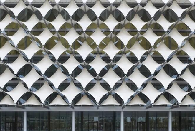 立面的外表皮是由長菱形的織物材料組成,這些白色薄膜通過立體的帶拉伸力的鋼絲繩結(jié)構(gòu)支撐起來,即張拉膜結(jié)構(gòu),不但具有遮陽的功能,而且用一種新的現(xiàn)代科技的方式重新詮釋了阿拉伯帳篷結(jié)構(gòu)的傳統(tǒng)。這個(gè)古代文化與現(xiàn)代技術(shù)交相融合后產(chǎn)生的獨(dú)特造型,形成了一個(gè)渾然一體的且有威望感的建筑外觀。夜晚,建筑物的立面會閃爍出不斷變化著的不同顏色的光,成為這個(gè)城市的一座文化燈塔。