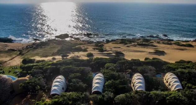 從空中俯瞰,36座繭狀的張拉膜帳篷散落在安靜的原始叢林中,為壯觀山海交界的森林盡頭增添了些許神秘和奢華的氣息。