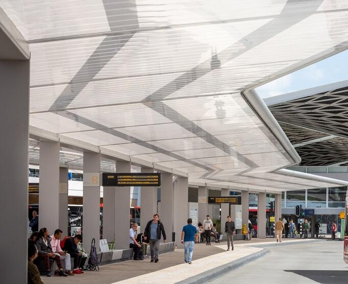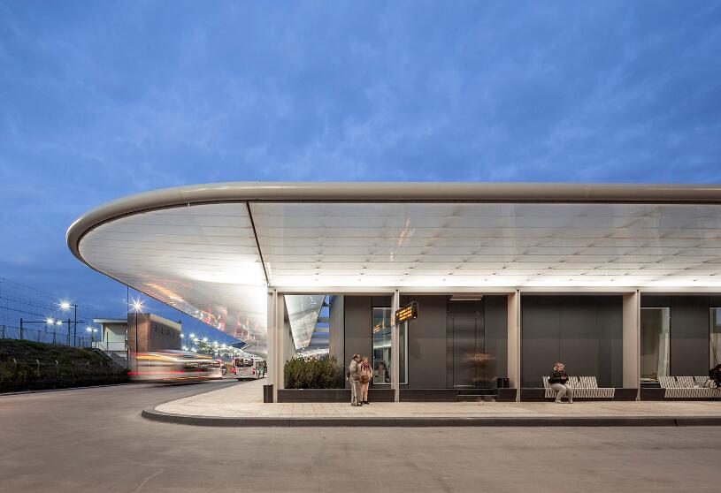 車(chē)站由一系列非常薄的柱子組成,頂部是一個(gè)簡(jiǎn)約的遮陽(yáng)蓬結(jié)構(gòu),形成了中心開(kāi)放,長(zhǎng)度超過(guò)160米的三角形流線。汽車(chē)停靠點(diǎn)沿著外側(cè)布置,共有6個(gè)上車(chē)點(diǎn)1個(gè)下車(chē)點(diǎn)。遮陽(yáng)篷結(jié)構(gòu)總體寬度為14到30米,結(jié)構(gòu)功能齊全與城市環(huán)境相協(xié)調(diào),寬闊的遮陽(yáng)蓬結(jié)構(gòu)完全覆蓋了整個(gè)公共汽車(chē)站臺(tái)和??科?chē)的一部分,因此旅客可以完全在遮陽(yáng)避雨的情況下上下車(chē)。