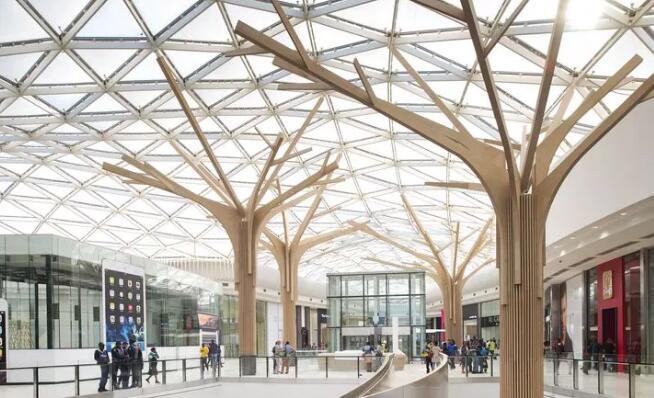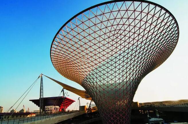 有的天幕雖然設計為曲面,但其曲面形狀的力學性能差,結構受力仍然以抗彎為主。這類曲面天幕結構與樹形柱相結合,才能以較細小的結構構件完成。