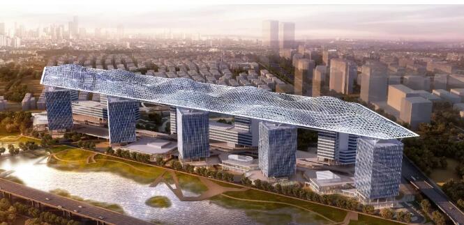 “云廊”平面尺寸長約730米、寬120米,波峰到波谷最大矢高16米。通過Y形外伸斜柱整體支承于由11棟間距50-100米的塔樓建筑群頂部,實現“如浮云一般連綿起伏”的形象,是一個超長、大跨的單層網格結構。