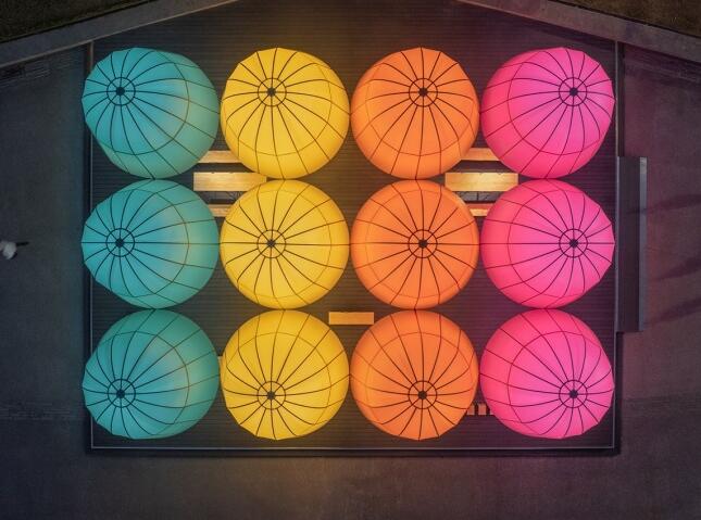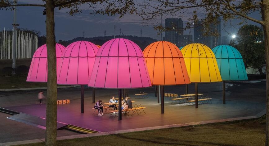 亭子穹頂部由彩色半透明的膜材料包裹,設計師希望材料能夠呈現(xiàn)類似紙張的質(zhì)感,光線可以穿透;其防水性也使亭子成為了雨天的臨時遮蔽場所。日間,透光材料遮蔽部分陽光,保證了亭下空間的舒適性;而在夜晚,點亮后的光亭多彩且柔和,成為城市晚間絕佳的公共活動空間。