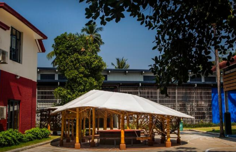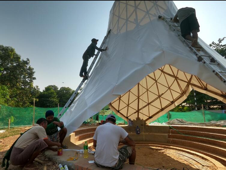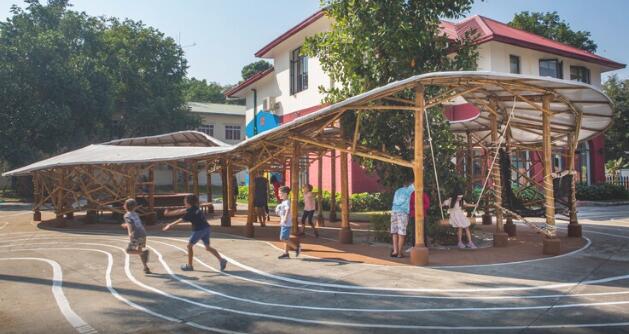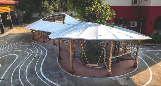 整個(gè)結(jié)構(gòu)由竹子和膜布建成,龍竹(Dendrocalamus giganteus )用于框架,銳藥竹(Oxytenanthera albocialiata Munro)用于弧形元素,而支撐和屋頂梁則采用泰竹(Thysostachys siamensis ), 屋頂覆蓋白色膜布,在∞形狀的兩個(gè)開口內(nèi)是場(chǎng)地的既有樹木和座位空間,供教師休息的同時(shí)能夠隨時(shí)視察孩子們的情況。