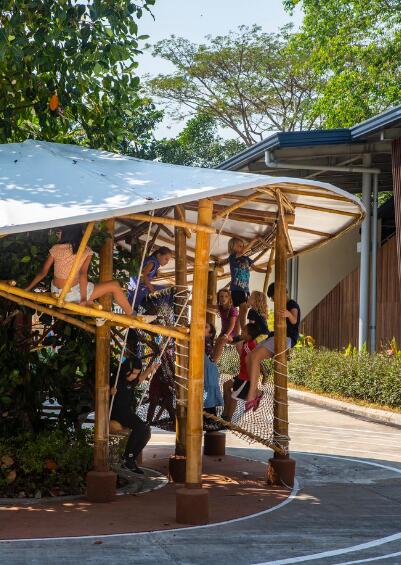 沒有任何游戲設(shè)施的游樂場(chǎng)最初坐落在一塊光禿禿的大型混凝土地板上。該項(xiàng)目圍繞場(chǎng)地上現(xiàn)有的兩棵樹編織成一個(gè)無限符號(hào)∞的結(jié)構(gòu)。在這個(gè)結(jié)構(gòu)下設(shè)有一系列游戲:先是竹竿攀爬、魚網(wǎng)攀爬、過云梯、坐秋千,最后是緬甸式跳格子,依次重復(fù)進(jìn)行。這些游戲結(jié)合起來創(chuàng)造了一個(gè)無限長的障礙賽跑道。