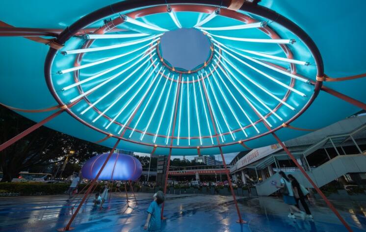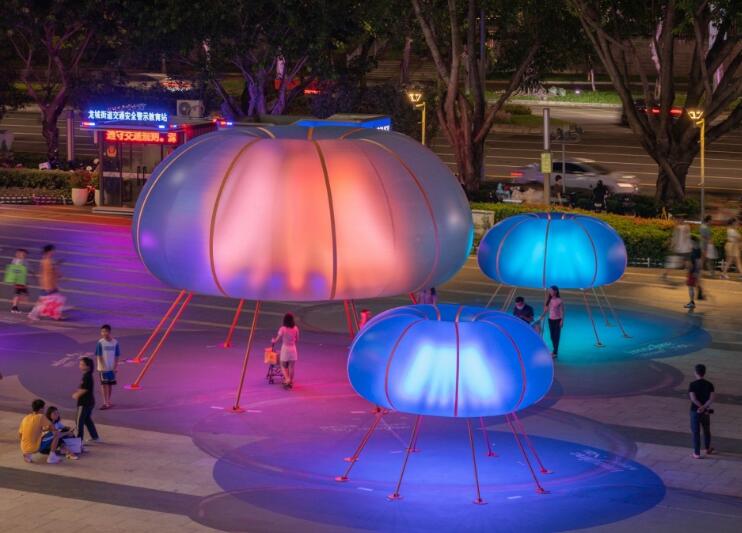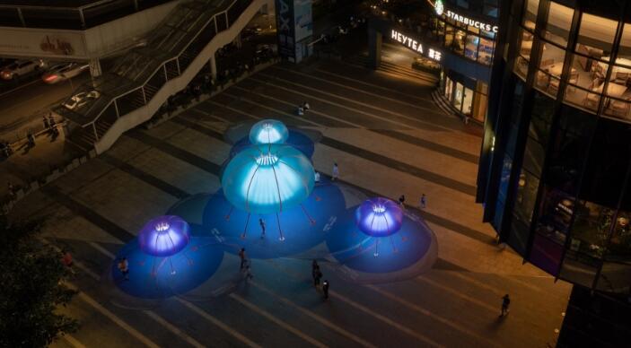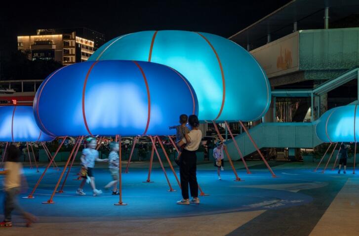 裝置的核心結構是一座直徑7米、高5.5米的大型光亭,構成地標式的視覺焦點。這座光亭提供了可仰望觀看的尺度,仿若深海中的巨型水母,使人們在光影間充分沉浸于幻想的世界,置于其中的聲音裝置也從聽覺層面疊加了更為豐富的體驗。