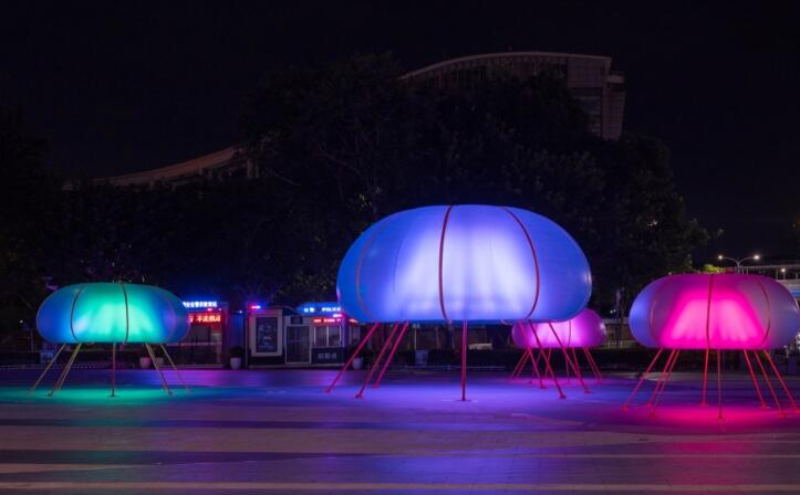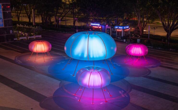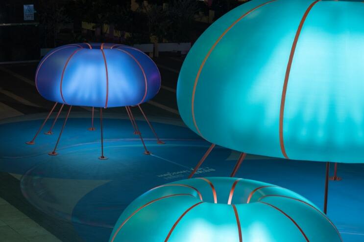“光之浮想”的創(chuàng)作靈感來自遠古時期就已存在的海洋浮游生物——水母。受水母輕盈的傘狀形態(tài)及豐富色彩的啟發(fā),作品將目光投向“浮想”的自由空間與“光”的超現實體驗。