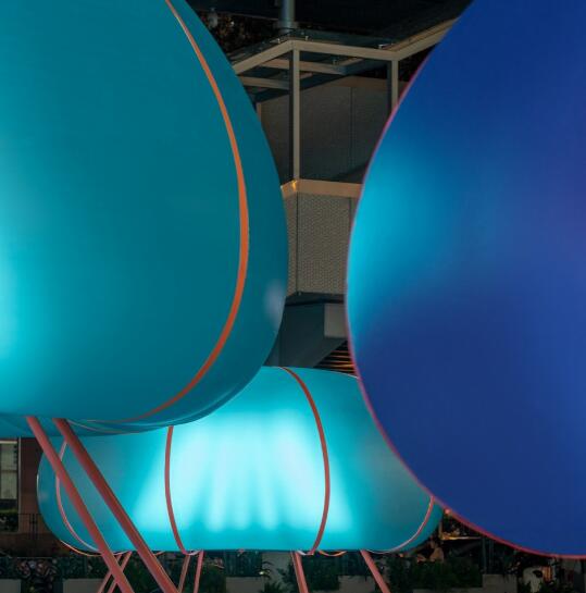 裝置表面的氣膜隨自然有機體而賦彩,綠色、紫色及鵝黃柔軟悅目,其中容納的編程燈光采用全色域RGB燈具,色彩隨時間緩慢變幻,“呼吸”的頻率設為每六秒一次,讓人類的呼吸與深海中水母浮游的節(jié)奏同頻,帶來充滿生機的特別感受。