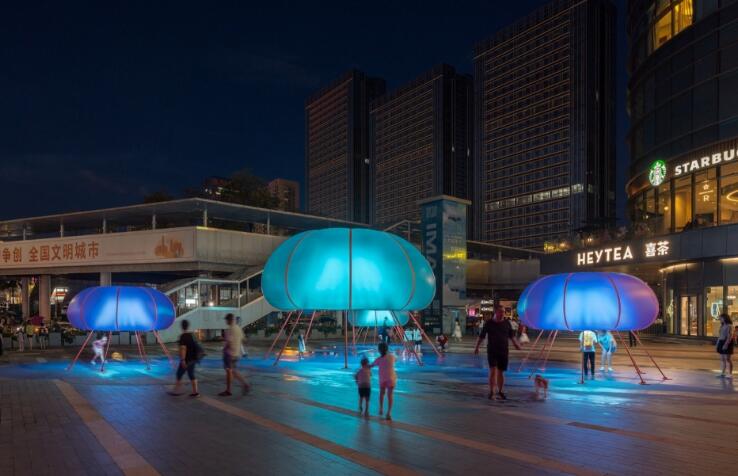 該空間藝術裝置“光之浮想”位于深圳龍崗萬科廣場。錯落有致的光亭矩陣點亮夜晚的廣場,為城市和社區(qū)帶來充滿幻想色彩和創(chuàng)造力的場景體驗,將日??臻g轉變?yōu)槌休d情感與活力的公共場所。