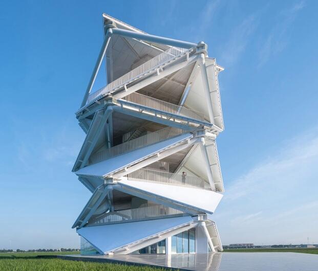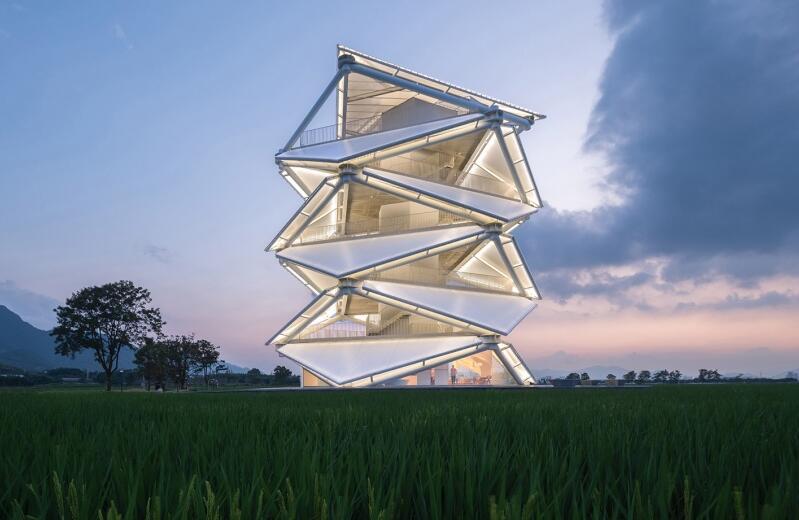 設(shè)計(jì)的靈感來源于對成熟稻穗的抽象表達(dá),以統(tǒng)一的三角形為母題完成了整個(gè)構(gòu)筑物的形式和結(jié)構(gòu),并在垂直高度上變化、旋轉(zhuǎn)和重構(gòu)。