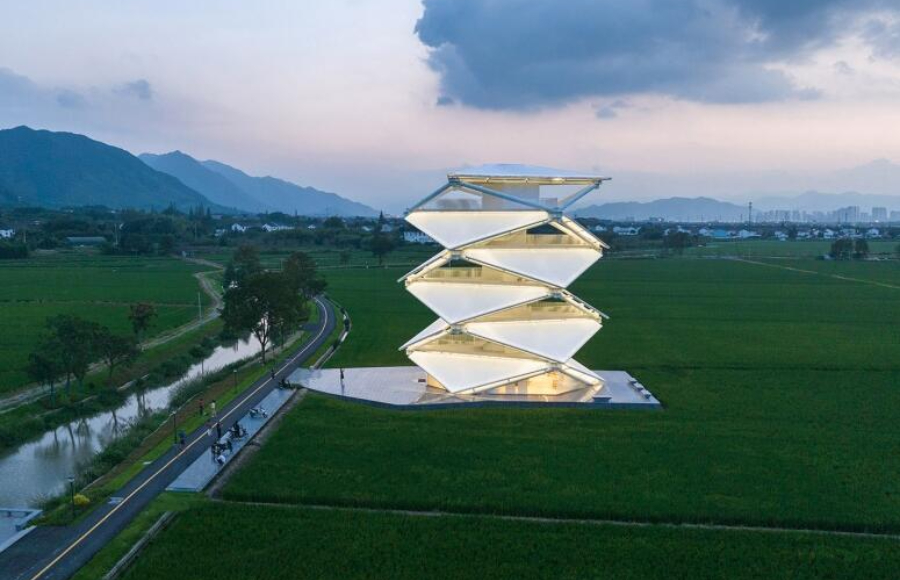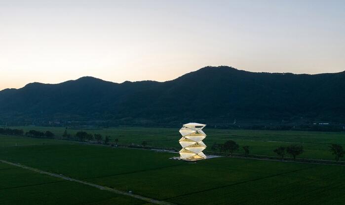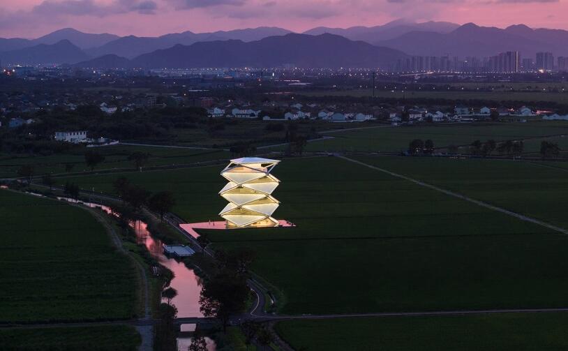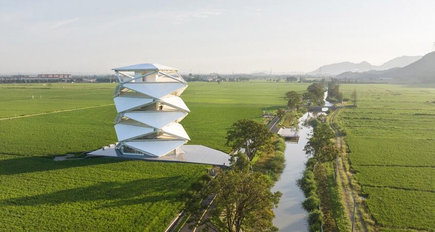 稻田上的燈塔作為寧波奉化區(qū)西塢街道 “萬畝方”項(xiàng)目最有標(biāo)志性的構(gòu)筑物,它的落成為當(dāng)?shù)氐泥l(xiāng)村提供了新的觀景點(diǎn)和社交聚集地。瞭望塔塔高23m,坐落于國家級現(xiàn)代農(nóng)業(yè)先行示范區(qū)高標(biāo)準(zhǔn)農(nóng)田的中心區(qū)域。它如同雕塑一般從稻田中螺旋升起,三角形元素和白色膜材定義了其簡潔的設(shè)計(jì)語言,在鄉(xiāng)村大地上賦予了其強(qiáng)烈的存在感。