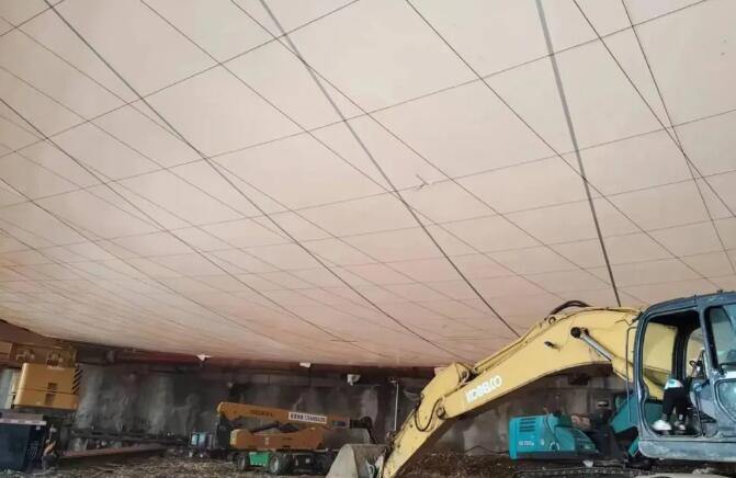 氣膜底部設(shè)置了高強(qiáng)度鋼纜,傳遞膜面受力,大幅度減少膜的應(yīng)力,保障膜的安全穩(wěn)定性。在突發(fā)極端情況下,膜材可落至網(wǎng)狀拉索上,從源頭杜絕塌落安全風(fēng)險。