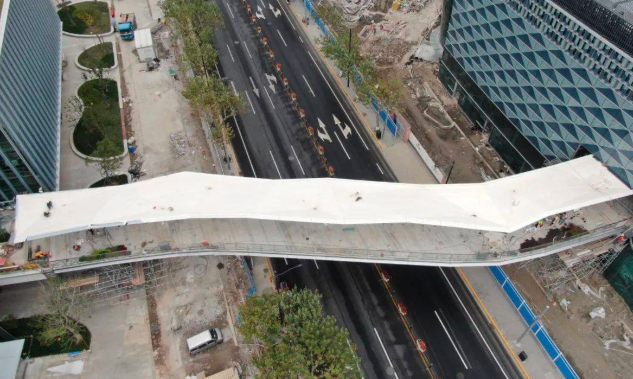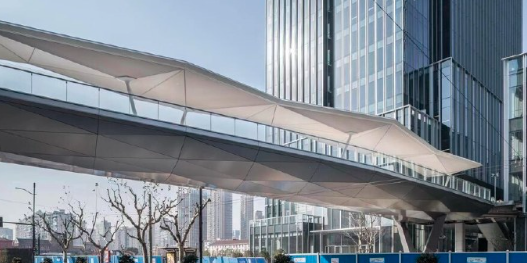 北外灘空中連廊示范段首創(chuàng)帶膜結(jié)構(gòu)陽光棚,總長4.5公里成為世界最長城市連廊系統(tǒng)。