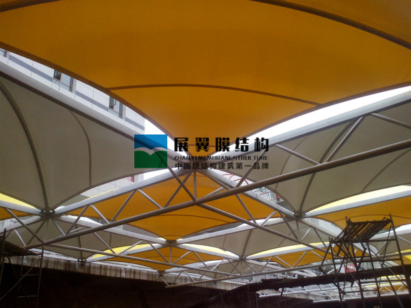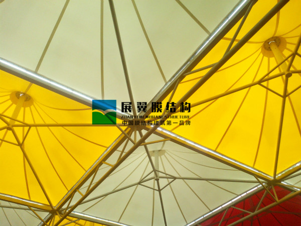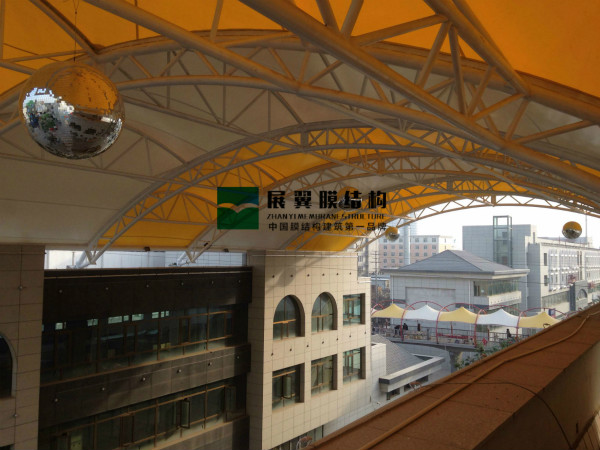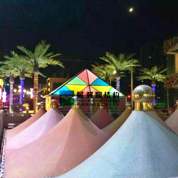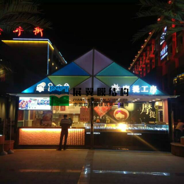 蘭州金牛街膜結(jié)構(gòu)工程全系列包括膜結(jié)構(gòu)天井、膜結(jié)構(gòu)屋頂遮陽(yáng)棚、膜結(jié)構(gòu)天橋通道遮陽(yáng)棚、啤酒屋膜結(jié)構(gòu)屋頂、特殊膜材玻璃房等等、工程全部采用彩色膜材搭配建造,造型設(shè)計(jì)別出心裁。這些張拉膜建筑不但具備強(qiáng)大的實(shí)用功能,同時(shí)也成為了商業(yè)街一大觀賞亮點(diǎn)。