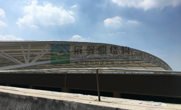 東莞某廠房屋面膜結(jié)構(gòu)工程目前正在施工中,該屋面天幕采用鋼構(gòu)及膜材的結(jié)合,完美的覆蓋整個廠房,更多工程圖片后續(xù)上傳。