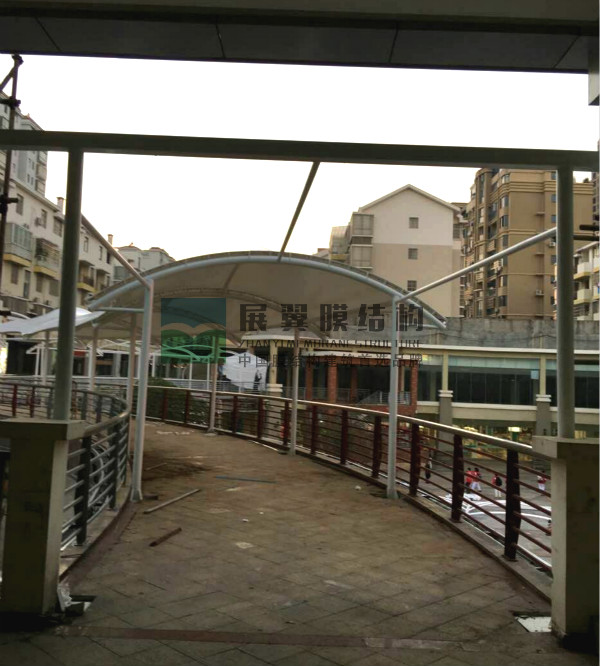 江西贛州萬盛廣場室外1-5號電梯張拉膜雨棚均已安裝完成,而廣場天橋通道同樣采用張拉膜來建造,近日該通道膜結(jié)構(gòu)正在施工當(dāng)中,膜材覆蓋安裝工作已過半,不日將正式完工。下面為工程圖片: