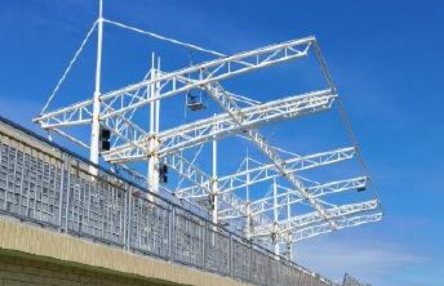 廣州天河區(qū)職業(yè)技術(shù)學(xué)院膜結(jié)構(gòu)體育看臺工程已完成鋼結(jié)構(gòu)安裝工序,接下來進行膜材覆蓋工作,整個看臺懸挑12米,膜覆蓋面積近500平方米。