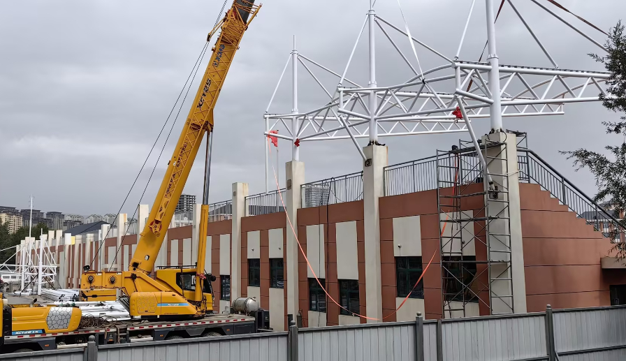 青海海東三中張拉膜結(jié)構(gòu)工程正在施工,工程體量包含風(fēng)雨操場(chǎng)看臺(tái)及主席臺(tái)罩棚,目前已完成鋼結(jié)構(gòu)吊裝工作,接下來(lái)進(jìn)行膜材的覆蓋。