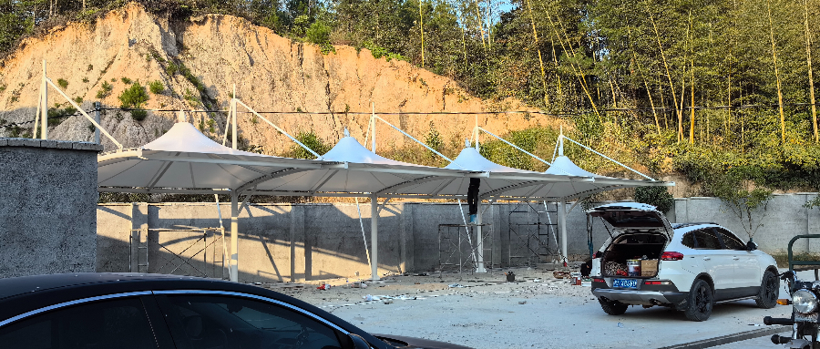湖北張拉膜停車棚工程近日完工,車棚設計為尖頂單邊懸挑造型,結(jié)構(gòu)穩(wěn)固,美觀大方。