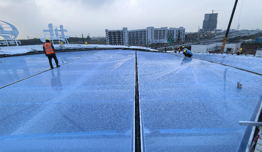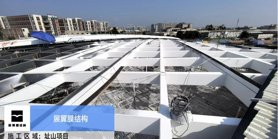 江門址山服務(wù)區(qū)ETFE膜結(jié)構(gòu)屋頂項(xiàng)目進(jìn)入緊張的施工階段,目前鋼結(jié)構(gòu)安裝完成,正在進(jìn)行膜材的安裝,工程面積逾3000平方米。