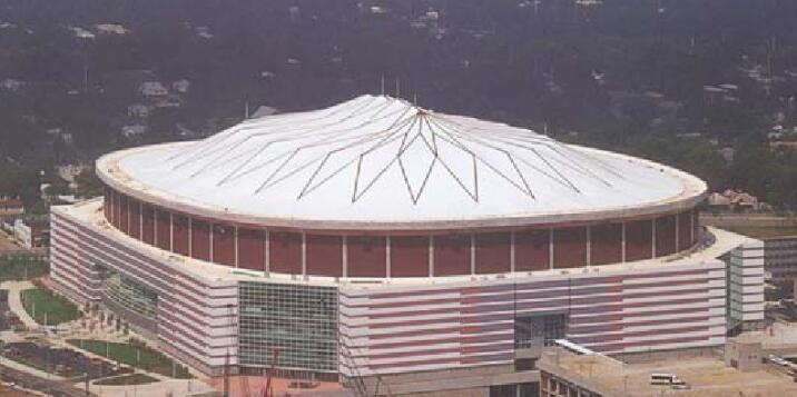 佐治亞穹頂展示了索膜穹頂?shù)臉?gòu)成,周邊為橢圓形的受壓剛性環(huán)梁,嵌固于環(huán)梁上的是環(huán)向遞近的索網(wǎng)(上、下拉索與下環(huán)索)和豎向壓桿(飛桿)組成的三角形空間網(wǎng)格張力體系,膜面嵌固在穹頂上部的棱形索網(wǎng)格上,索膜穹頂經(jīng)施加預(yù)應(yīng)力后成型,成型后的棱形膜面沿長(zhǎng)向的坡度應(yīng)能順暢地排水。