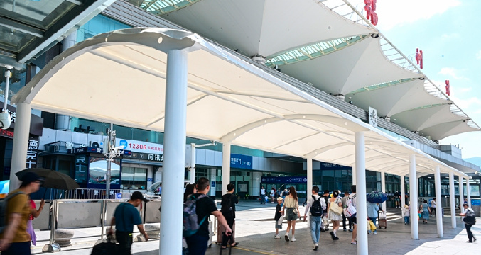 宜賓高鐵站采用膜結(jié)構(gòu)連廊天幕,兼具遮陽與導(dǎo)流功能。