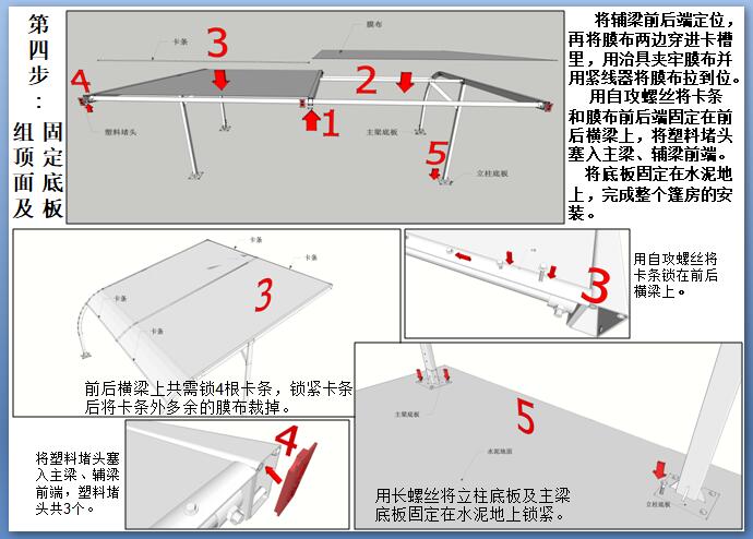 膜結(jié)構(gòu)停車(chē)棚安裝步驟說(shuō)明如下: